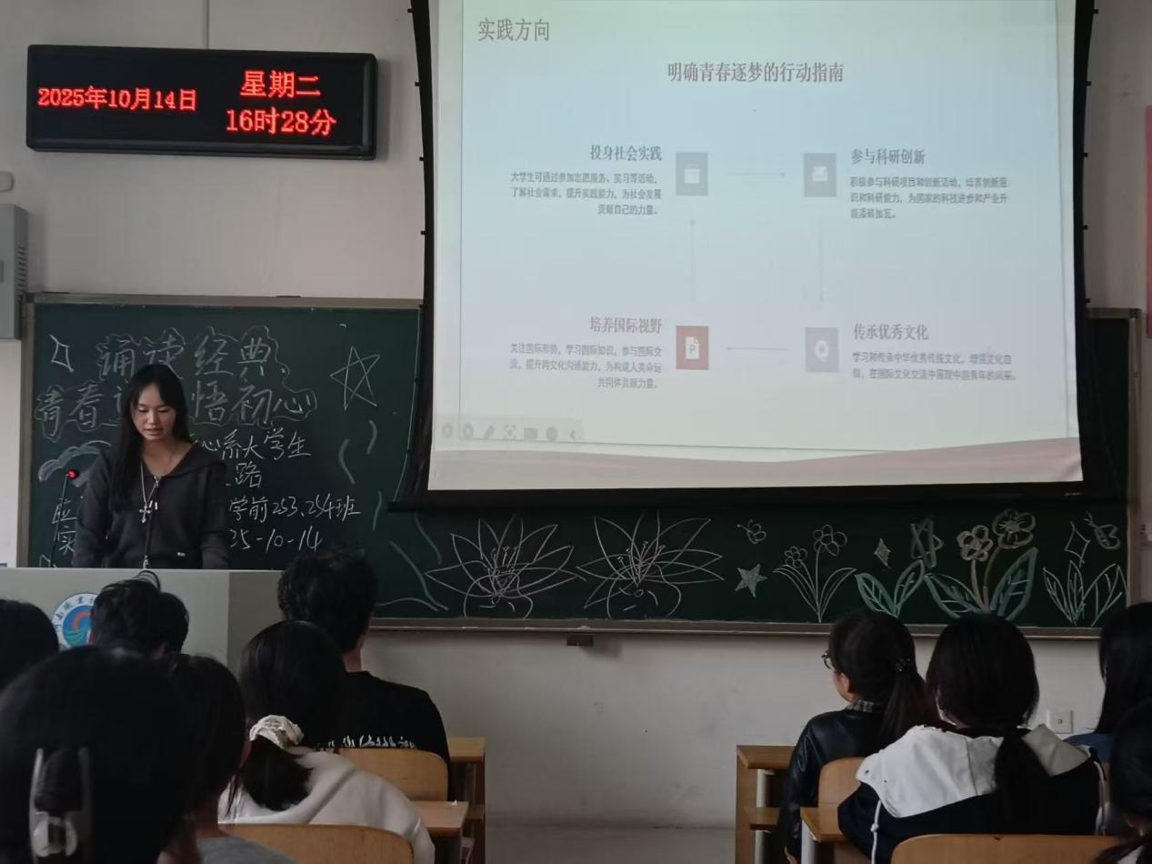 团课期间,同学们积极参与诵读活动,大声朗读经典诗词和习近平总书记关于青年成长的重要论述。一句句经典诗词,如同一盏盏明灯,照亮了同学们的心灵;一段段重要论述,似一声声号角,激励着大家奋勇向前。在学习习近平总书记关于“高校思想政治工作关系高校培养什么样的人、如何培养人以及为谁培养人这个根本问题”等重要讲话时,同学们结合音乐专业特点,展开了热烈讨论。大家深刻认识到,作为音乐专业学生,肩负着以音乐育人、以艺术化人的重要使命,不仅要提升自身专业素养,更要注重品德修养,努力成为德智体美劳全面发展的社会主义建设者和接班人。同学们表示,要将音乐与思政教育相结合,用美妙的旋律传递正能量,以动人的歌声唱响时代主旋律。
