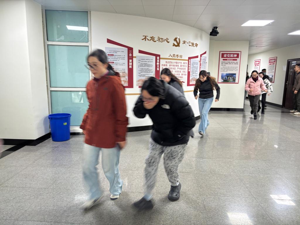 随后,模拟火灾场景的逃生演练有序开展。随着雅兴楼内警报声响起,全体老师迅速反应,遵循“低姿捂鼻、有序撤离”的规范要求,弯腰低姿前行,用湿毛巾捂住口鼻,有条不紊地从楼中疏散出来,高效完成了疏散集结。整个演练过程紧张有序,充分检验了应急反应能力和团队协作精神。