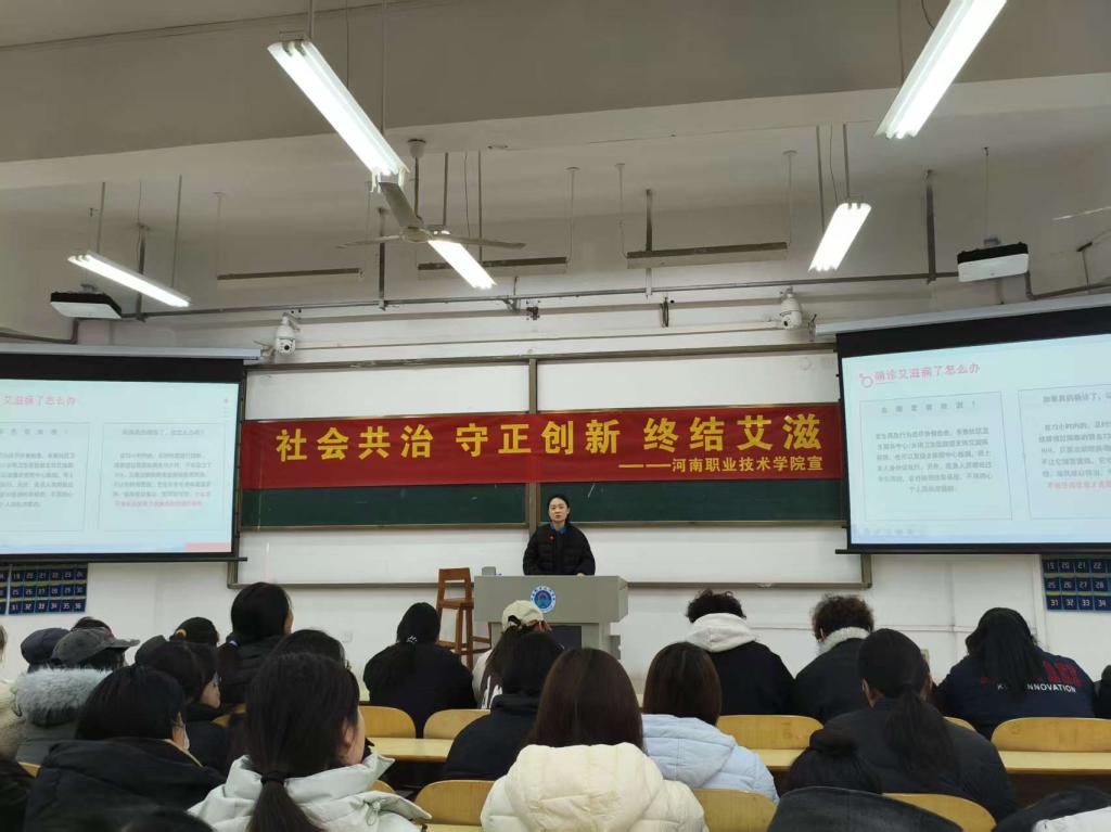 为积极响应艾滋病防治工作要求,增强师生对艾滋病、丙肝等疾病的防范意识,12月4日下午,我院25名学生代表参加了“社会共治,守正创新,终结艾滋”的艾滋病防治知识专题讲座,讲座由郑州颐和医院国际健康管理中心的乔璐主治医师主讲,我校后勤管理处副处长霍书海主持。
