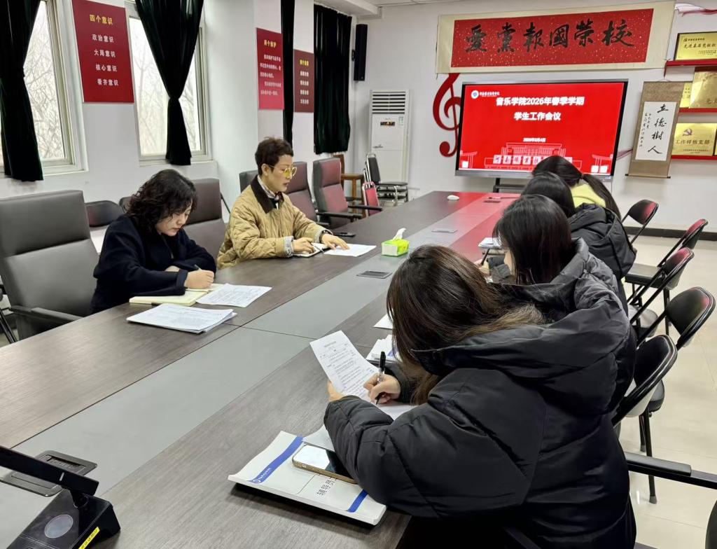 为全面落实立德树人根本任务,统筹推进春季学期学生教育管理服务工作,压紧压实校园安全稳定责任,3月4日上午,音乐学院召开2026年春季学期开学第一次学生工作会议。学院副书记祁姗姗和全体辅导员参会,会议围绕思想引领、学风建设、心理关怀、实习就业等重点工作进行专题部署,确保新学期学生工作开好局、起好步。