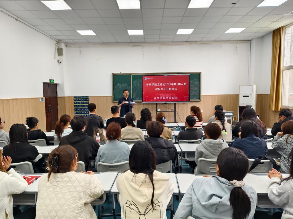 为深入学习贯彻习近平新时代中国特色社会主义思想,全面落实新时代党的建设总要求和新时代党的组织路线,加强青年党员后备力量培养,夯实党的基层组织建设,2026年3月30日中午,音乐学院2026年第1期入党积极分子培训班开班仪式在雅行楼B101顺利举行。学院党总支书记张燕祥、副书记祁姗姗,教师党支部书记王达亮、学生党支部书记张洁出席仪式,学生党支部组织委员司马赛博主持开班仪式。